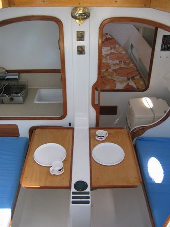 Inside there has been a lot of consideration given to cruising amenities. There is a dedicated heads compartment complete with book rack for the out of date magazines at the forward end of the main cabin. Queen sized beds are not common in boats this small, but that's what you'll find up forward, with enough headroom to sit comfortably up in bed reading. Access and ventilation is out through the forward hatch. There is a huge amount of storage underneath the bed flat. In the main cabin there are two big quarter berths aft, good leg space and enough room to move about without banging heads. The handy galley has good space to prepare meals while not being in the way of others moving about the boat and again there is plenty of locker space.